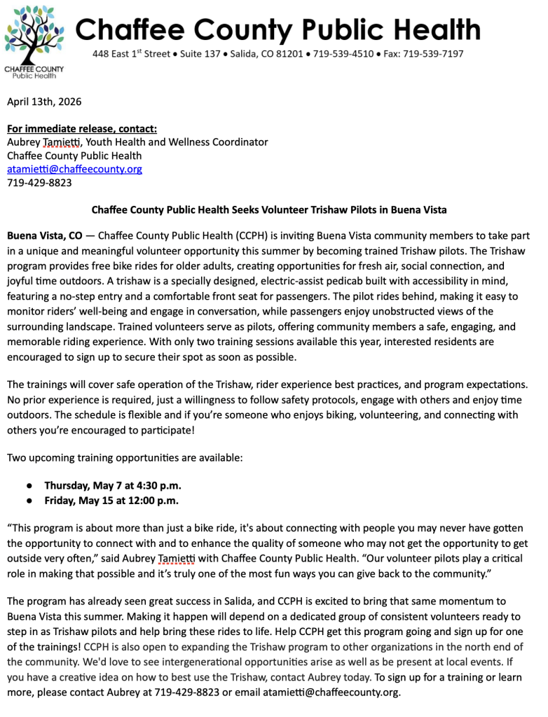 Chaffee County Public Health Seeks Volunteer Trishaw Pilots in Buena Vista Posted by Dan R | Apr 15, 2026