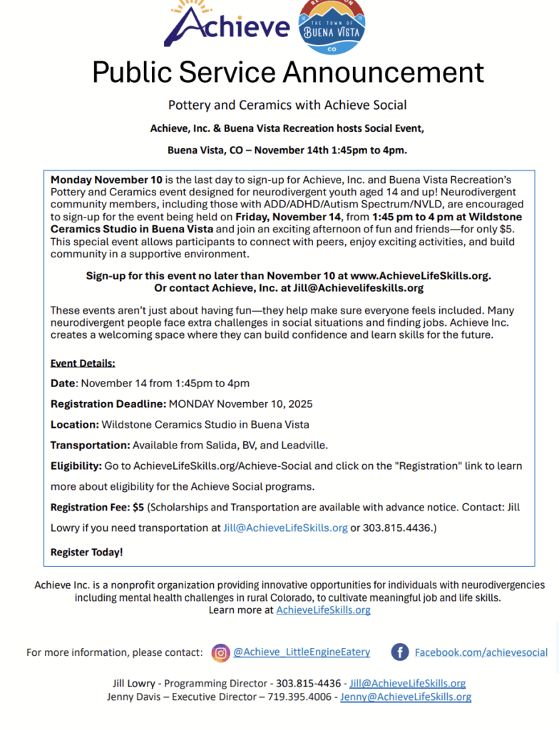 Today is the final day to register for Achieve, Inc. and Buena Vista Recreation’s Pottery and Ceramics workshop, created specifically for neurodivergent youth ages 14 and older.