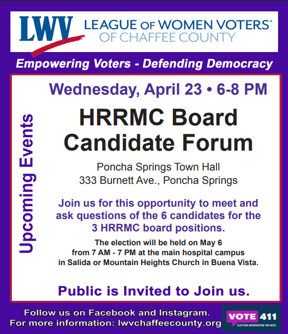 The League of Women Voters of Chaffee County will host a candidate forum for the Heart of the Rockies Regional Medical Center Board of Directors on Wednesday, April 10th, from 6:00 to 8:00 p.m. at the Poncha Springs Town Hall.