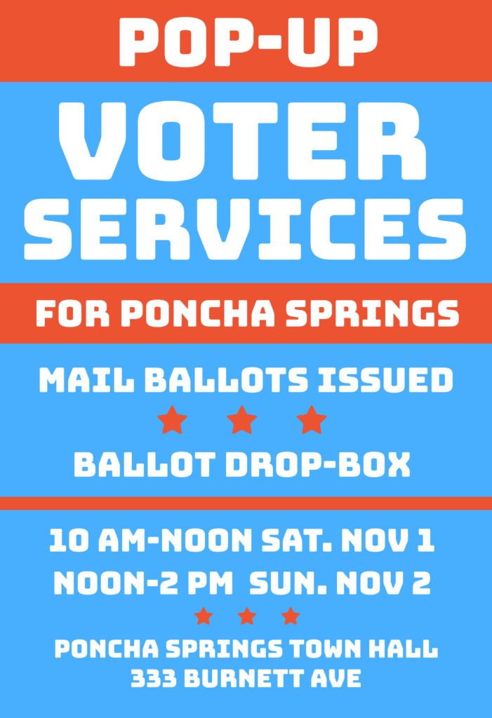 This Pop-up Voter Center will be held at the Poncha Springs Town Hall (333 Burnett St) on: