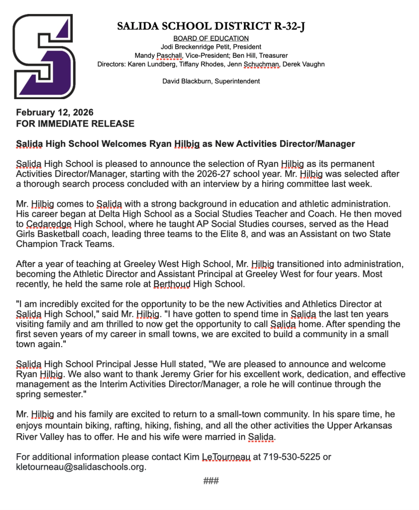 Salida High School Welcomes Ryan Hilbig as New Activities Director/Manager Posted by Andrew Stossmeister | Feb 13, 2026