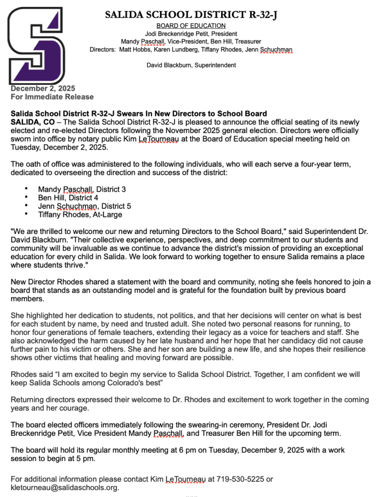 Salida School District R-32-J Swears in New Directors to School Board Posted by Andrew Stossmeister | Dec 3, 2025