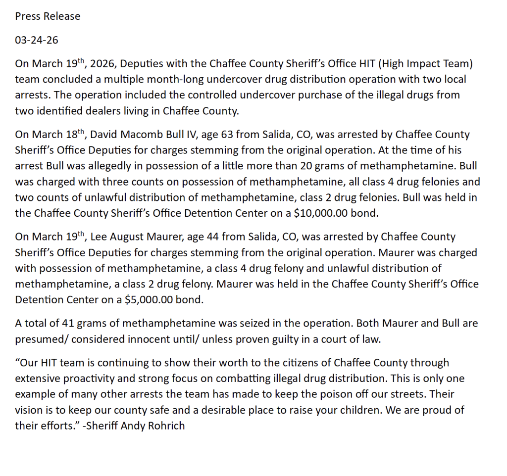 Undercover Drug Operation in Chaffee County Ends with Two Arrests Posted by Andrew Stossmeister | Mar 25, 2026
